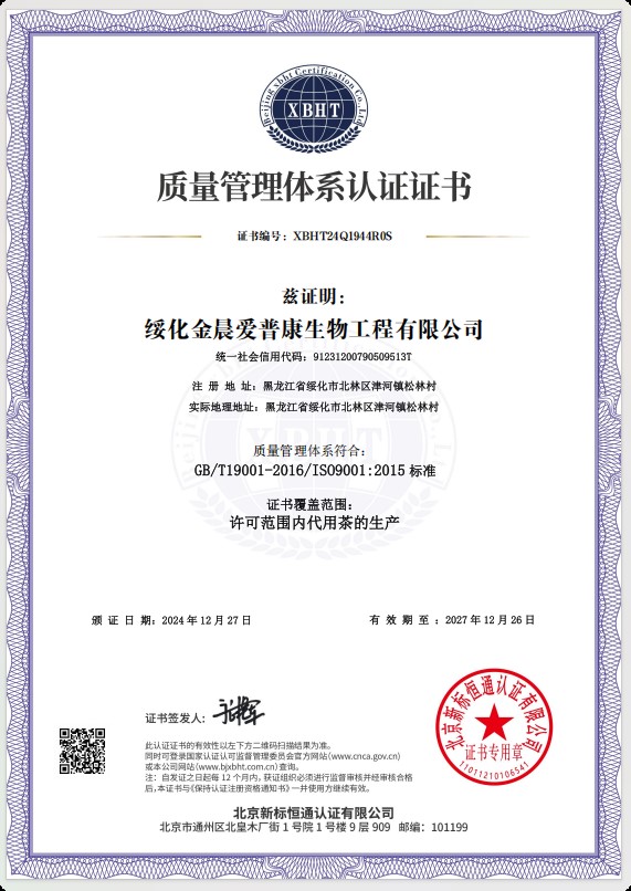 綏化金晨愛普康生物工程有限公司位于黑龍江省中南部地區(qū)的綏化市北林區(qū),所處位置東經(jīng)124度,北緯45度,位于松嫩平原的呼蘭河流域,“有寒地黑土,塞北江南”的美譽,是全國重要的商品糧基地,屬中溫帶大陸性季風氣候,四季分明,雨熱同期,冬季冰雪覆蓋,夏季降雨集中氣候溫熱濕潤。綏化金晨愛普康生物工程有限公司是一家專業(yè)從事健康養(yǎng)生產(chǎn)品研發(fā)、生產(chǎn)及銷售企業(yè),公司占地總面積8000平方米,建筑面積5000平方米,公司周圍無任何污染源,是食品生產(chǎn)基地。公司生產(chǎn)車間潔凈度級別達到10萬級,同時擁有數(shù)十臺先進的生產(chǎn)設(shè)備及高科技檢驗儀器,從產(chǎn)品的原輔料、中間品、成品到銷售的全過程嚴格把關(guān),使生產(chǎn)中每道工序都符合產(chǎn)品的高標準要求,從而保證了公司生產(chǎn)的每一袋產(chǎn)品合格,無質(zhì)量缺陷。綏化金晨愛普康生物工程有限公司率先采用了企業(yè)資源ERP管理系統(tǒng),肩負著養(yǎng)生產(chǎn)業(yè)的重要課題,同時又是江蘇省國家藥用植物重點實驗中心科研成果轉(zhuǎn)化的生產(chǎn)試驗基地,公司核心成員均為本科以上學歷。生產(chǎn)的產(chǎn)品有近五十個品種的代用茶產(chǎn)品,公司先后通過HALAL國際認證,編號為SSPY-201318-33849;ISO9001質(zhì)量管理體系認證編號為XBH···